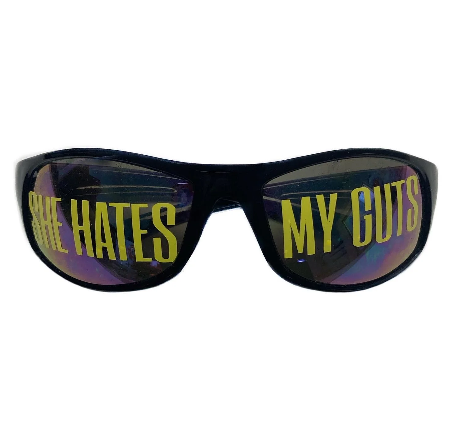 Image 1 of 1 "SHE HATES MY GUTS" $30.00 sold out Tinted Iridescent lens OpticsDesigned by Not Impressed Sold Out Added! Tinted Iridescent lens OpticsDesigned by Not Impressed